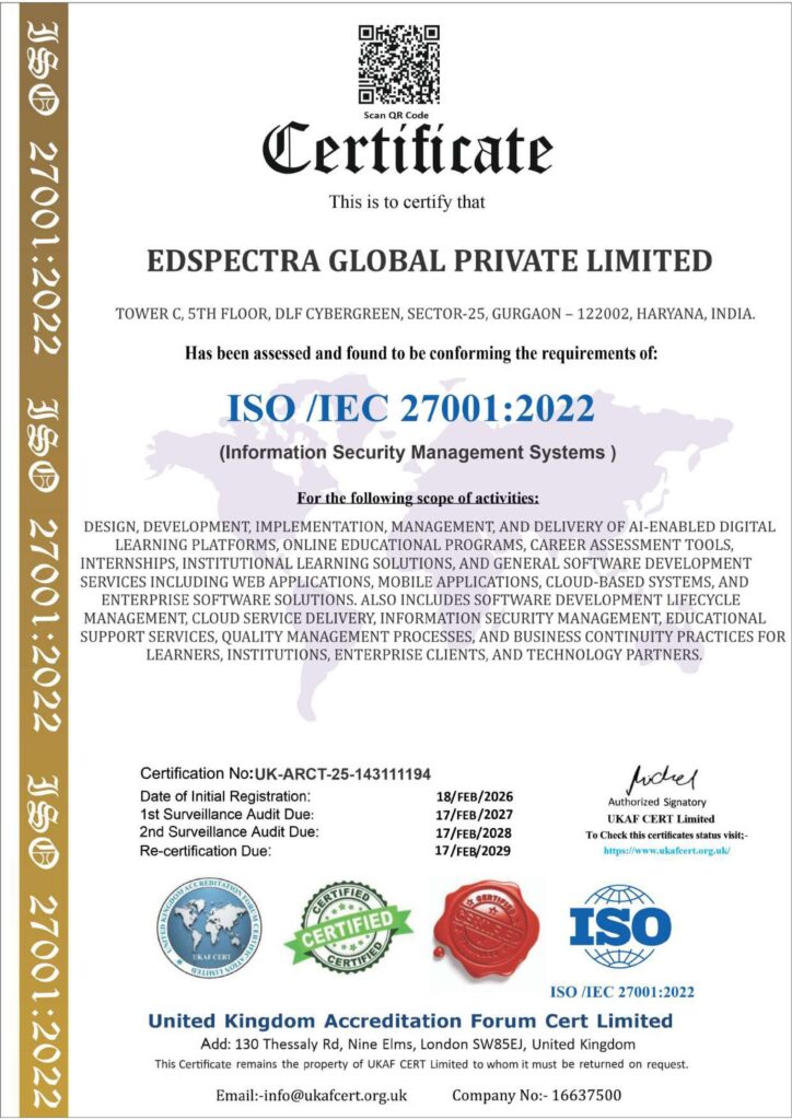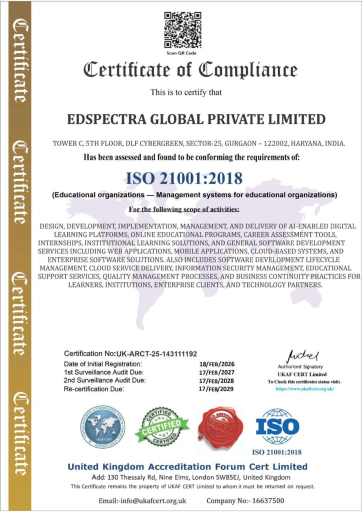 EdSpectra operates under globally recognized standards to ensure quality, data security, educational integrity, and operational resilience across all our platforms and services.